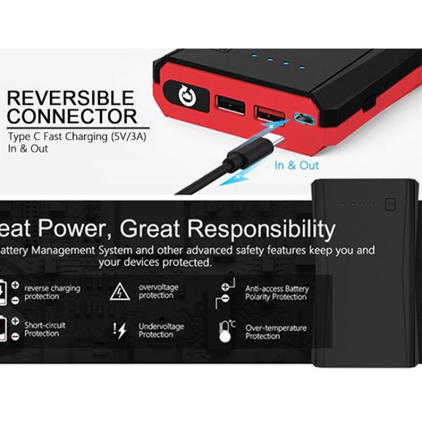Make sure you and your loved ones can get home when stranded. It will jump start 3.5L gas or 2.5L diesel engine up to 20 times on a single charge. It is also a portable power bank with the lastest technology, with Qualcomm quick charge 3.0 and usb c / type-c input / output port.